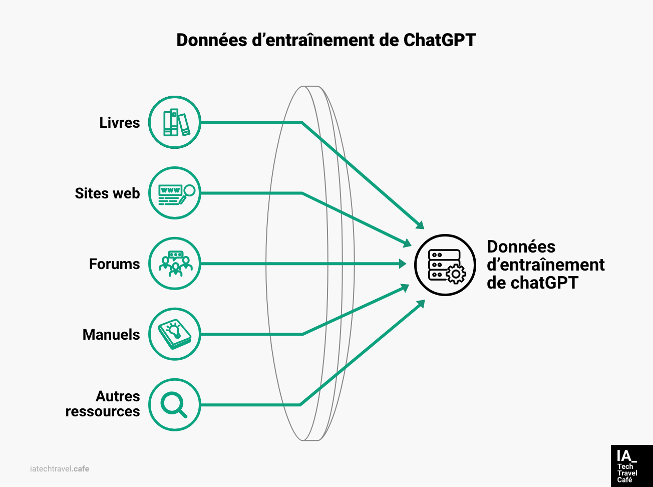 Pour ChatGPT, les données utilisées pour son entraînement (les fameux 43 To) proviennent d'une large variété de sources de données publiques comme des textes issus de livres, de sites web, de forums, de manuels et d'autres ressources accessibles en ligne, collectées jusqu'en octobre 2023 pour les versions GPT-4 et o1-preview (d’après ChatGPT). Ce socle de connaissances permet à ChatGPT de fournir des réponses générales et de comprendre le langage, mais il ne contient pas d'informations après ces dates.