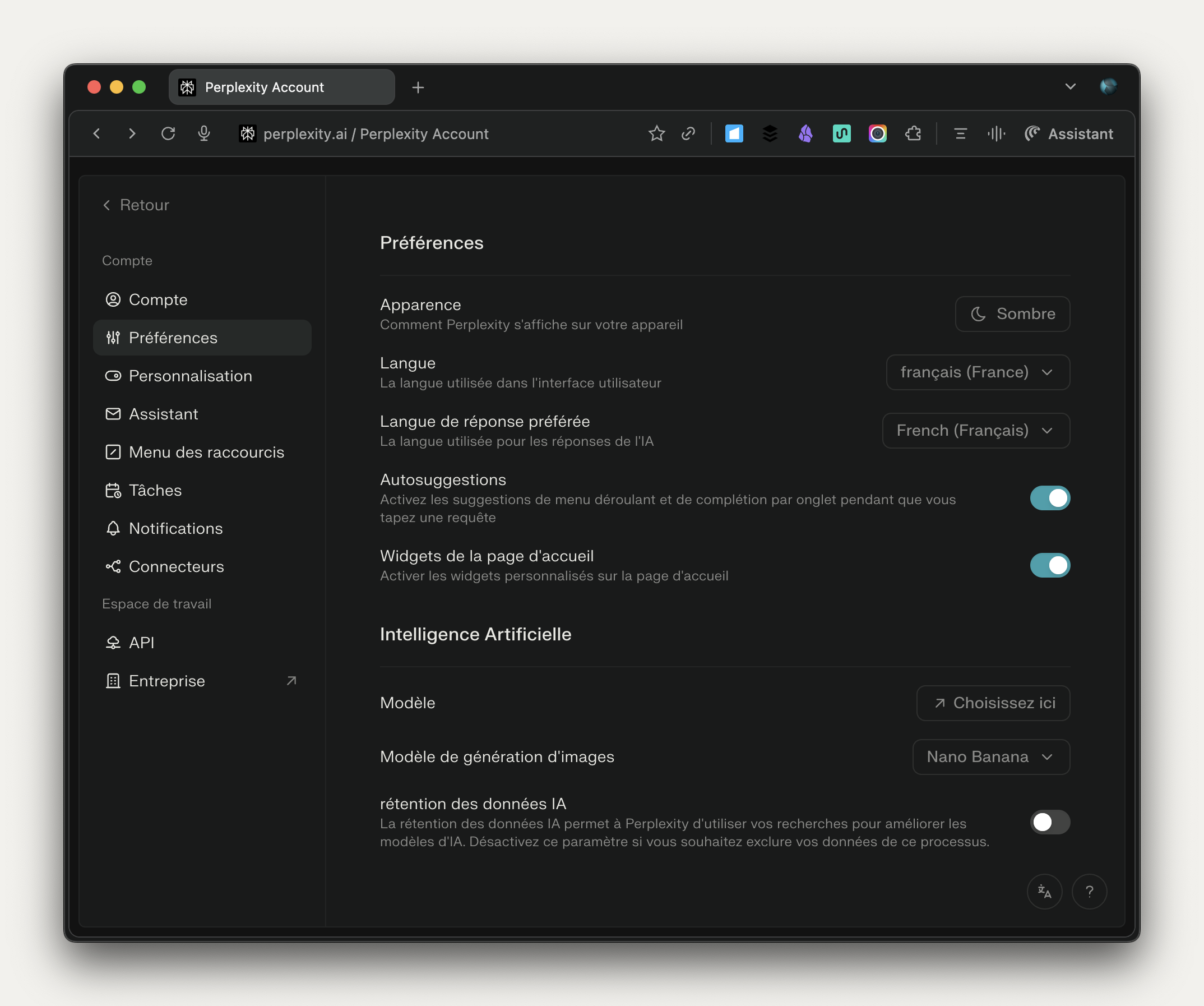 Le plus important ! Ce réglage détermine si vos requêtes peuvent être conservées pour entraîner les modèles d’IA. Désactivez-le si vous voulez que vos recherches restent privées et ne soient pas intégrées à l’apprentissage global.