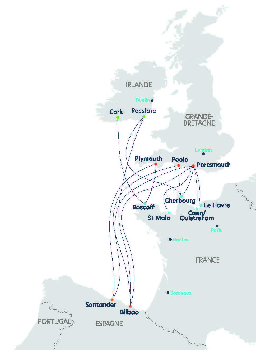 Fondée en 1972 à Roscoff, Brittany Ferries relie aujourd’hui la France, le Royaume-Uni, l’Irlande et l’Espagne. Elle opère principalement sur la Manche et le golfe de Gascogne, avec une flotte de 13 navires.