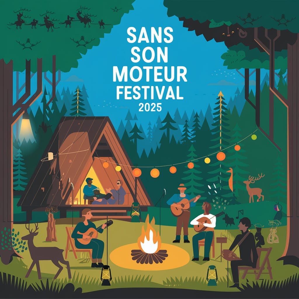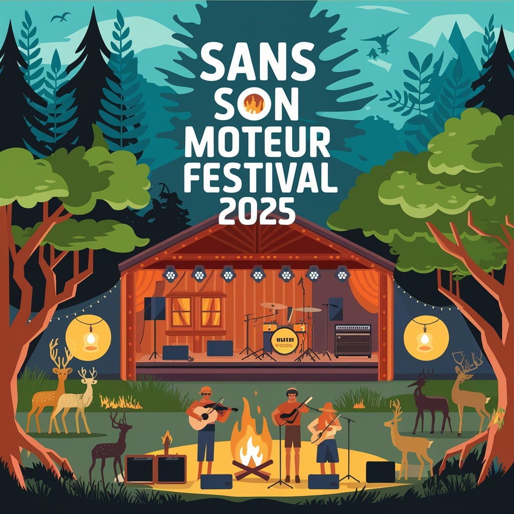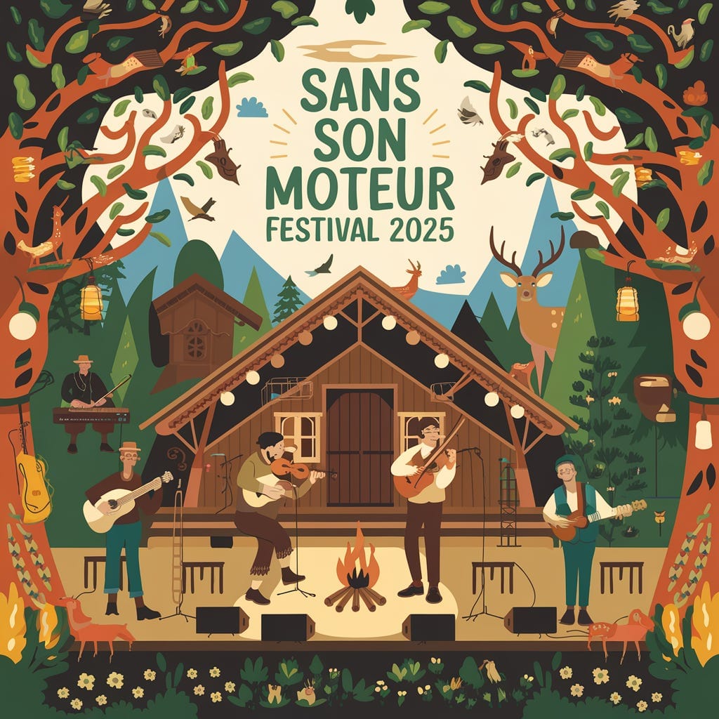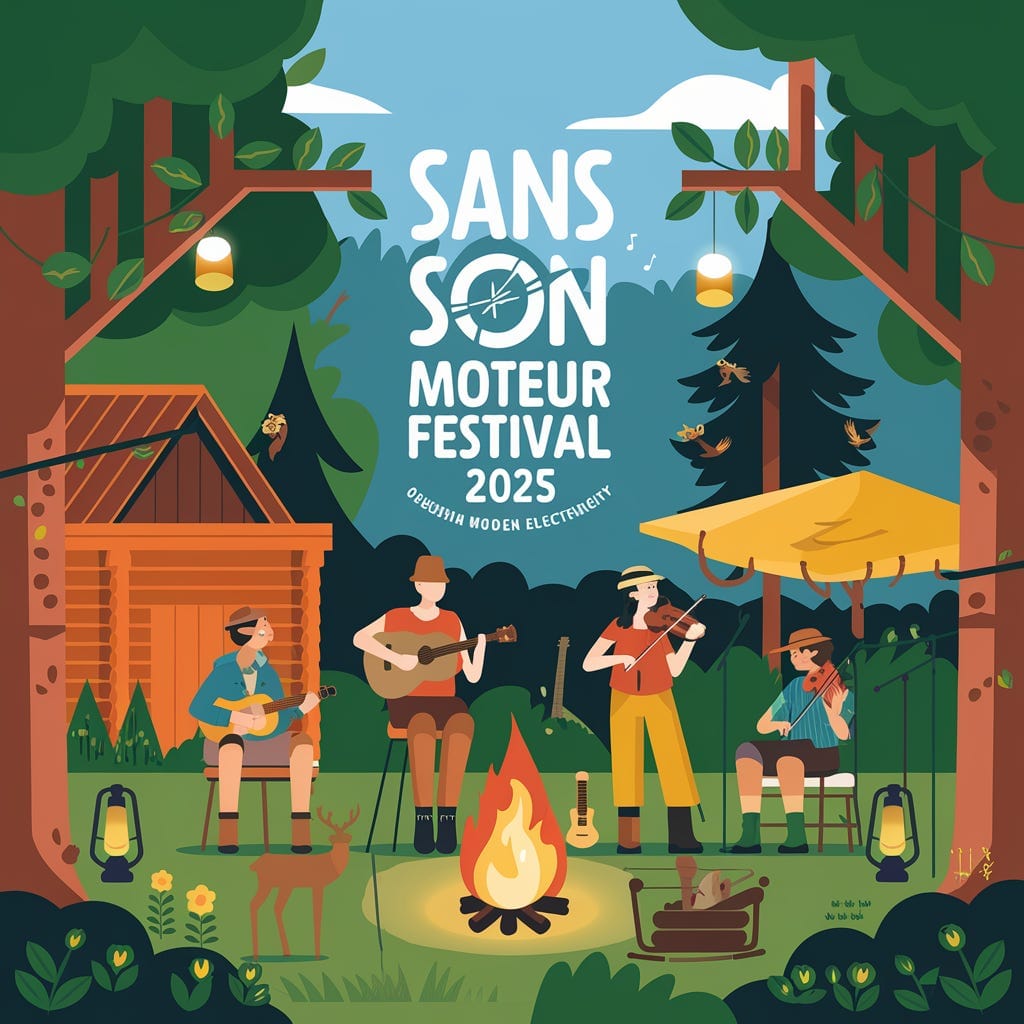 Affiche pour le festival “Sans Son Moteur Festival” – événement de musique acoustique sans électricité.