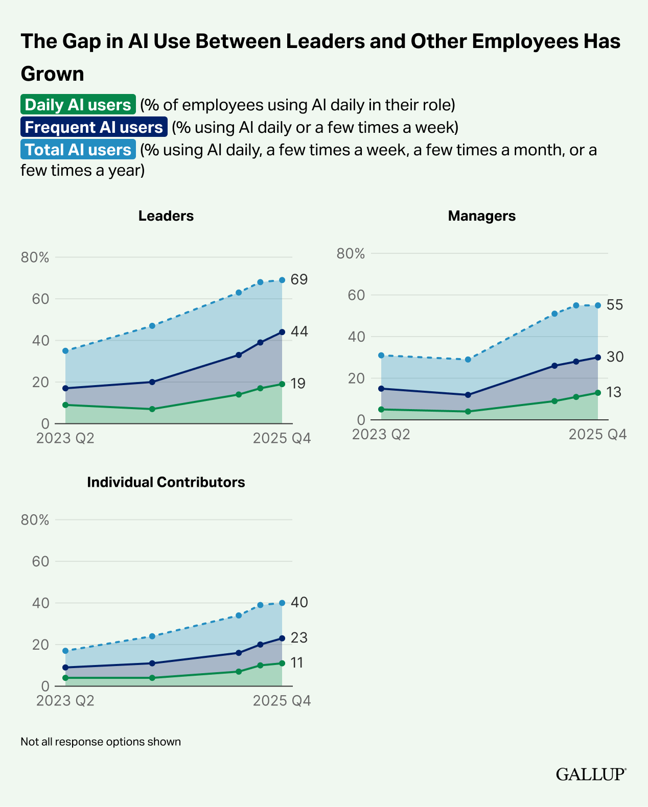 Le vrai risque, c'est l'adoption à deux vitesses. Selon Gallup (États-Unis), la croissance de l'adoption IA commence à plafonner, et elle serait très mal répartie. Les cadres et les moins de 40 ans progressent vite, pendant que les autres... stagnent.
