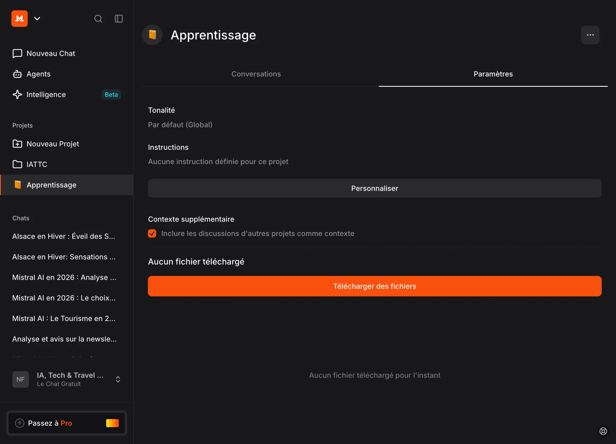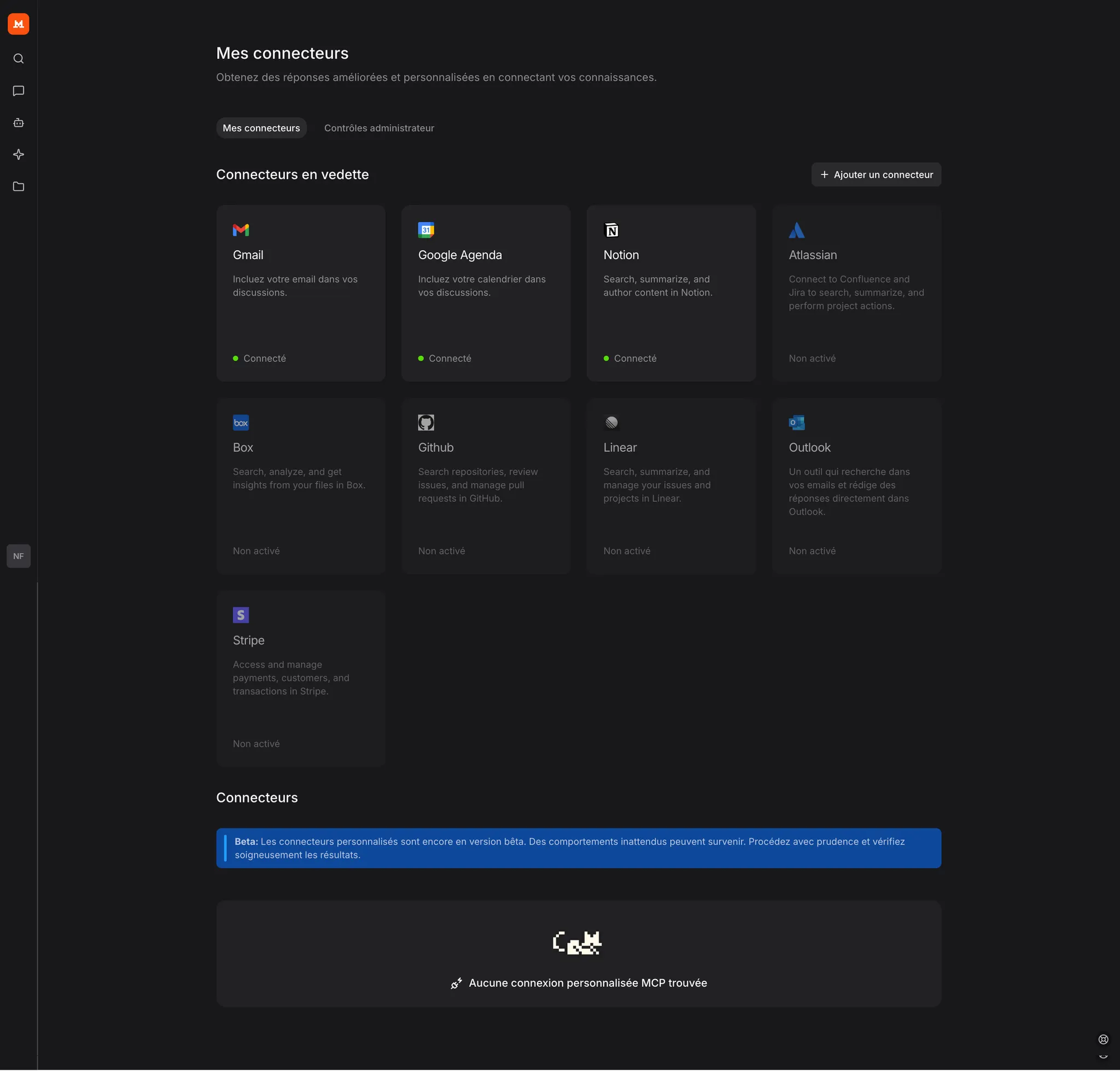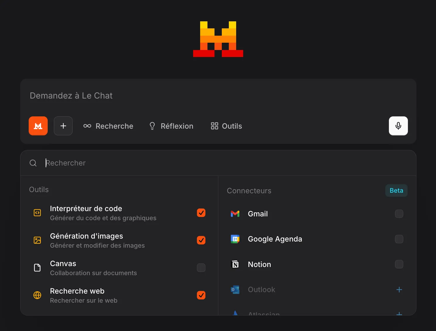 - Connecteurs → Mistral peut se connecter à Gmail, Google Agenda, Notion, Outlook… Vous pouvez les gérer via l'onglet "Connecteurs" dans le menu latéral (Intelligences > Connecteurs)