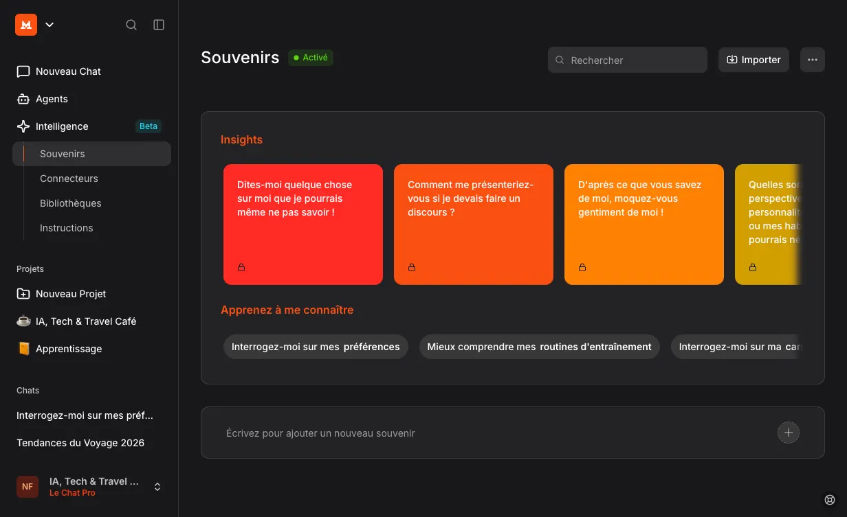 Le Chat peut désormais se souvenir de vos préférences, du contexte de vos projets, de votre ton de marque... Bref, tout ce que vous lui avez dit dans vos conversations passées.