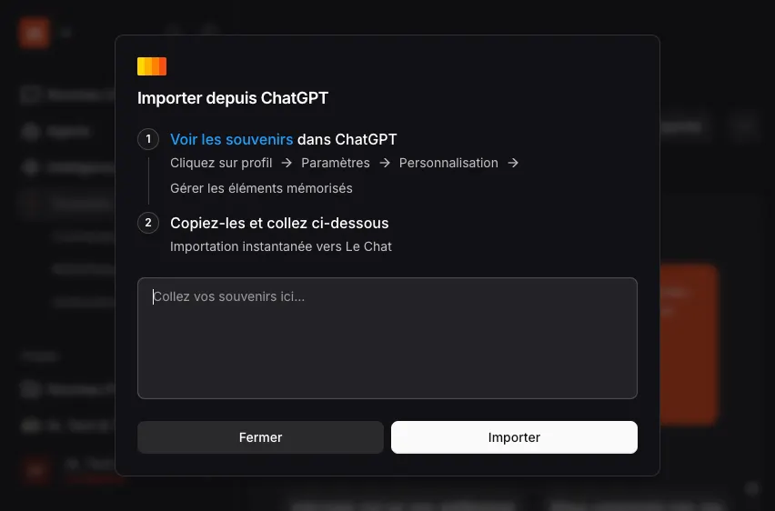 Vous utilisez déjà ChatGPT et vous ne voulez pas tout recommencer de zéro ? Mistral propose d'importer votre mémoire ChatGPT en un clic. Pratique pour tester sans perdre votre historique. J'ai testé la migration complète et ça marche ! Mais j’ai préféré recommencer de zéro pour partir sur de bonnes bases :)