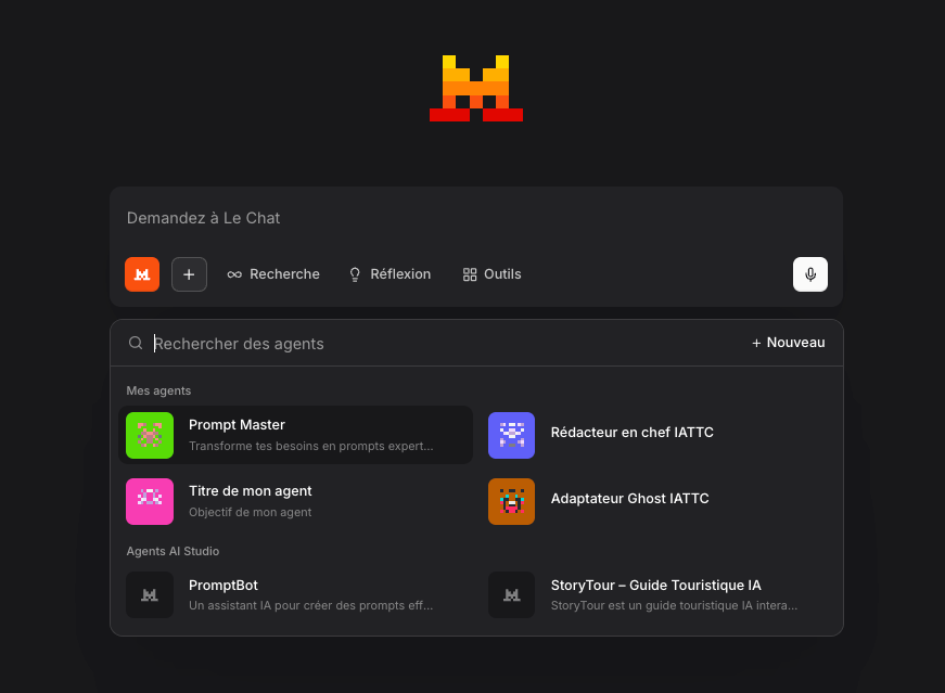 Qu'est-ce que c'est ? Ça vous permet d'accéder rapidement à vos assistants spécialisés (rédaction, SEO, analyse…). Vous les retrouvez également dans l'onglet "Agents" du menu de gauche et aussi dans Mistral AI Studio (je vous en reparle plus bas).