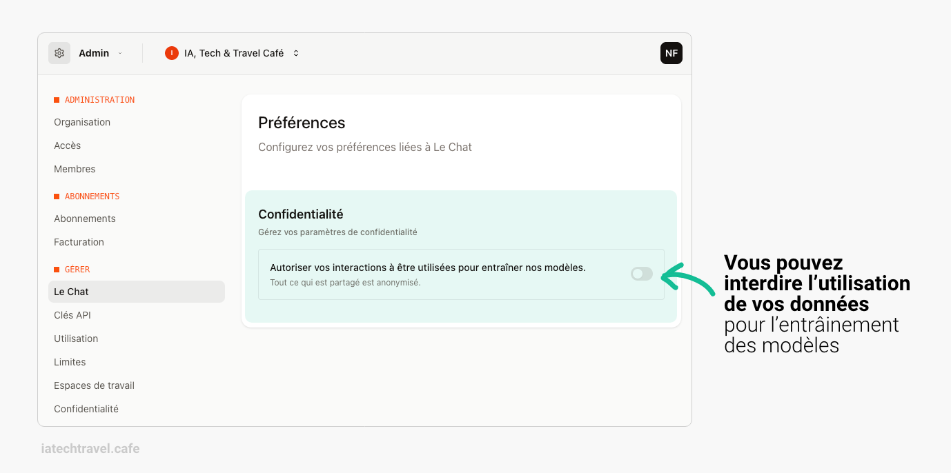 Oui, et c'est l'un de ses arguments majeurs. Mistral AI est une entreprise française, soumise au droit européen. Vos données ne traversent pas l'Atlantique, ne sont pas utilisées pour réentraîner les modèles (sauf opt-in explicite), et vous pouvez tout supprimer en un clic via la fonction "Memories". Pour une destination, un musée ou un hébergeur qui manipule des données personnelles, c'est un vrai plus.