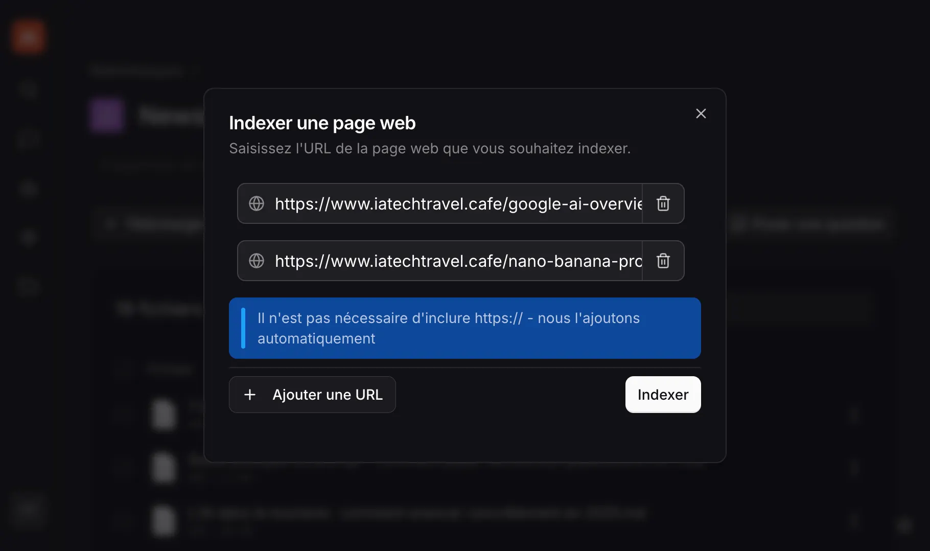 Les bibliothèques sont des espaces où vous regroupez vos documents par thématique. Tous les formats "standards" sont acceptés (doc, pdf, csv, md…) y compris des URLs. Vous pouvez d'ailleurs ajouter 10 liens d'un coup ! Mistral récupère alors le contenu des ces pages web et les organise automatiquement dans un format lisible (le fameux Markdown dont raffole l'IA).