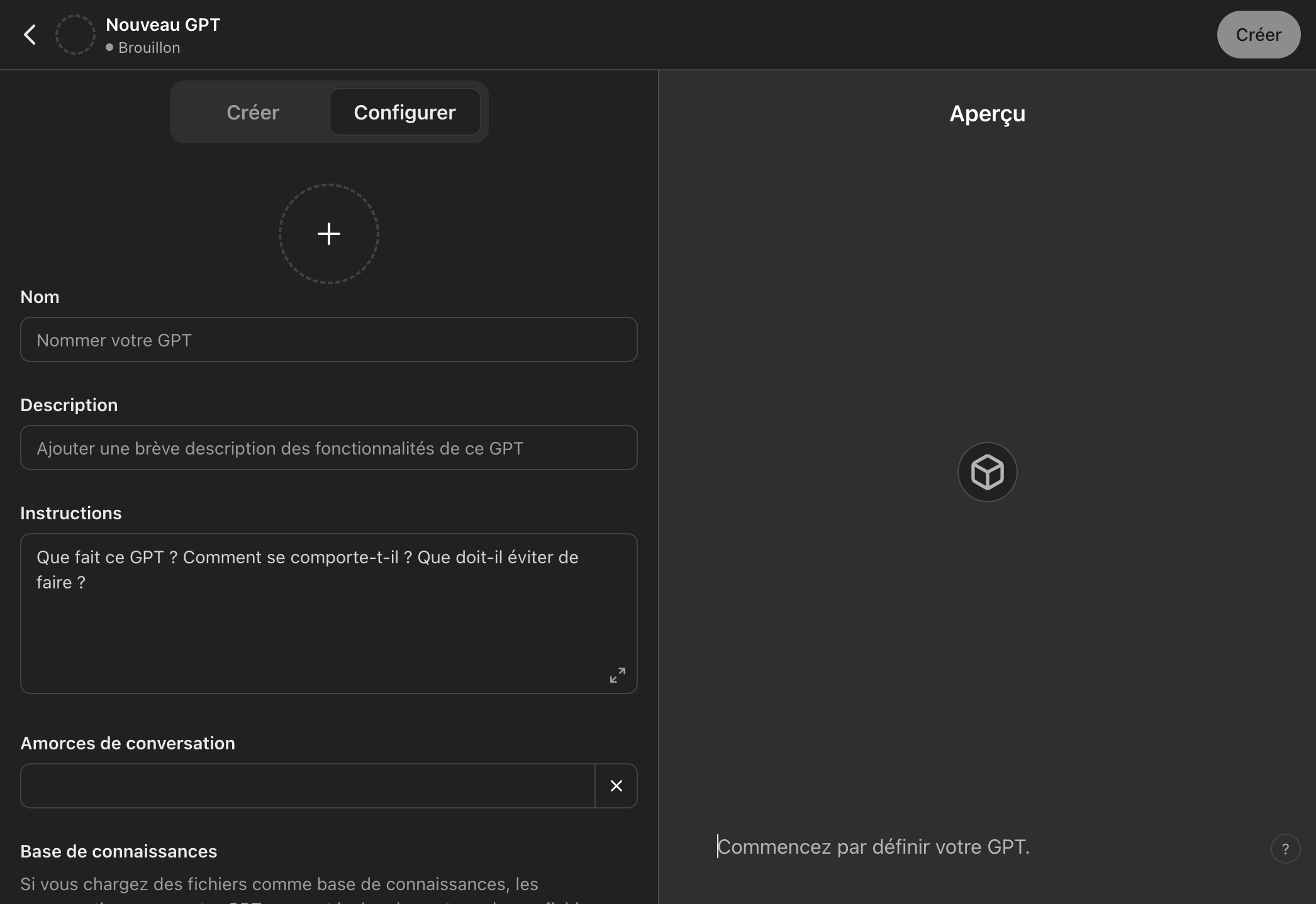 Pour configurer un Custom GPT, suivez ces étapes afin de disposer de votre propre GPT qui accédera directement à votre base de connaissances et répondra de manière spécifique à vos besoins.