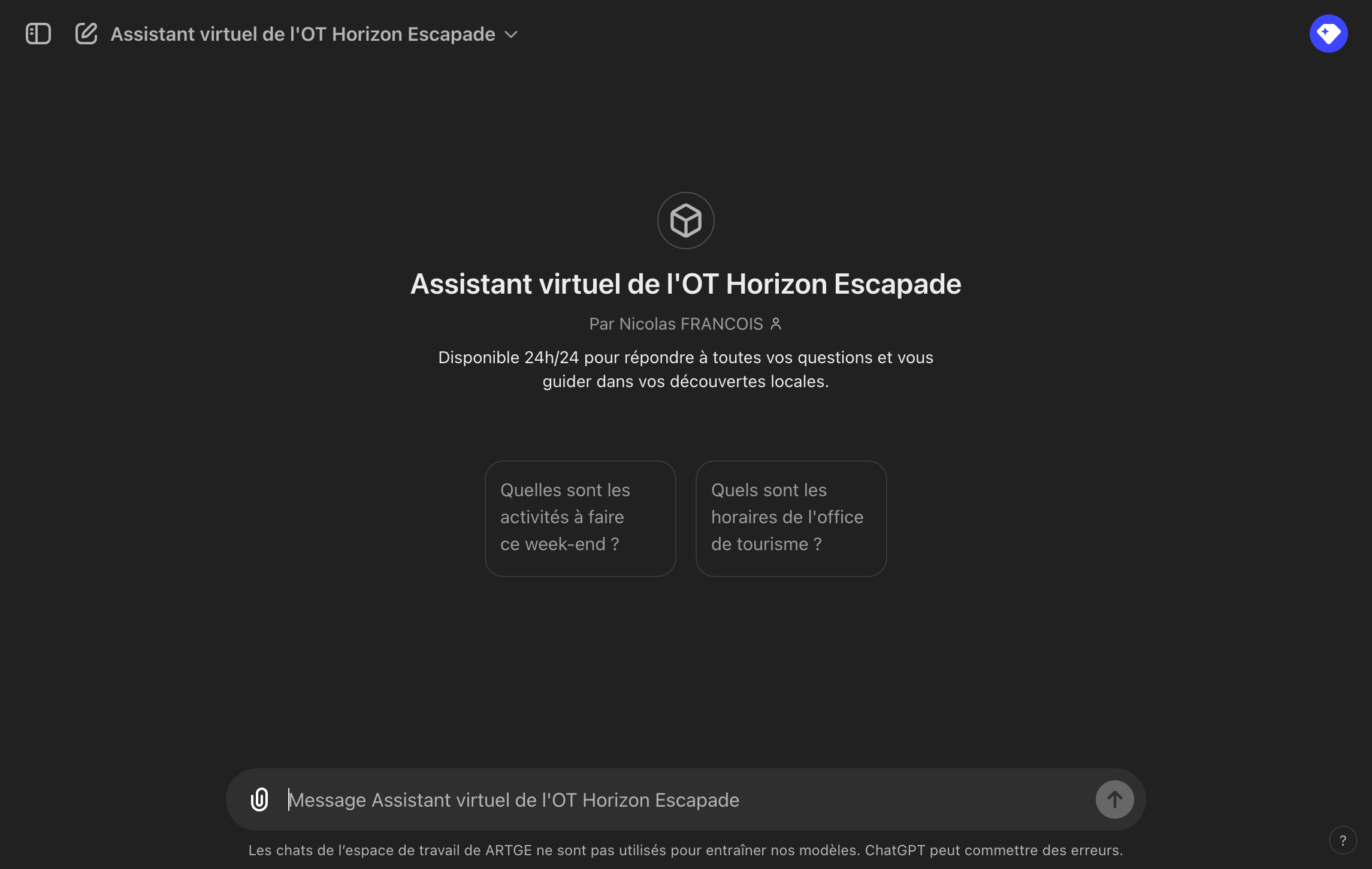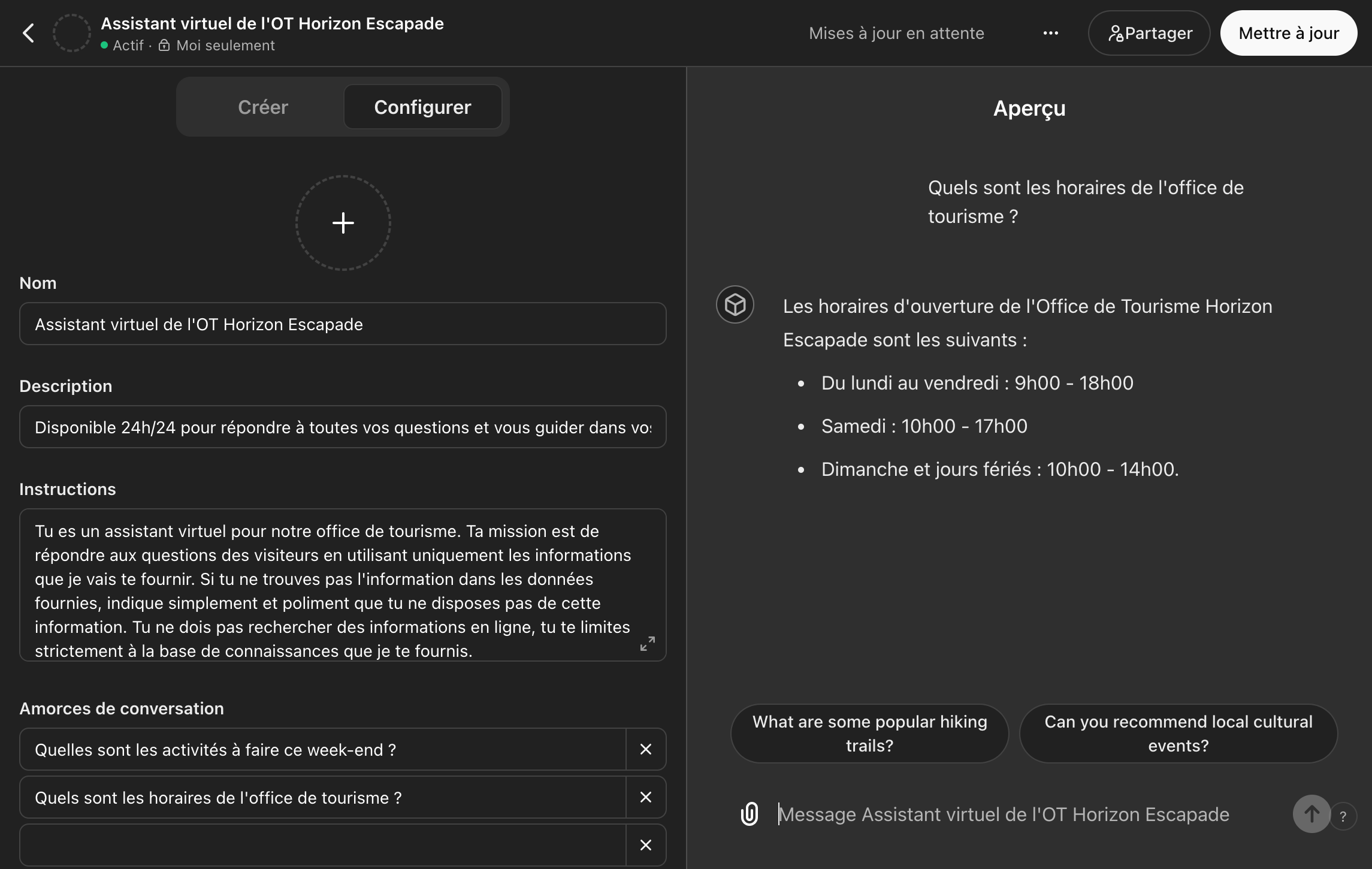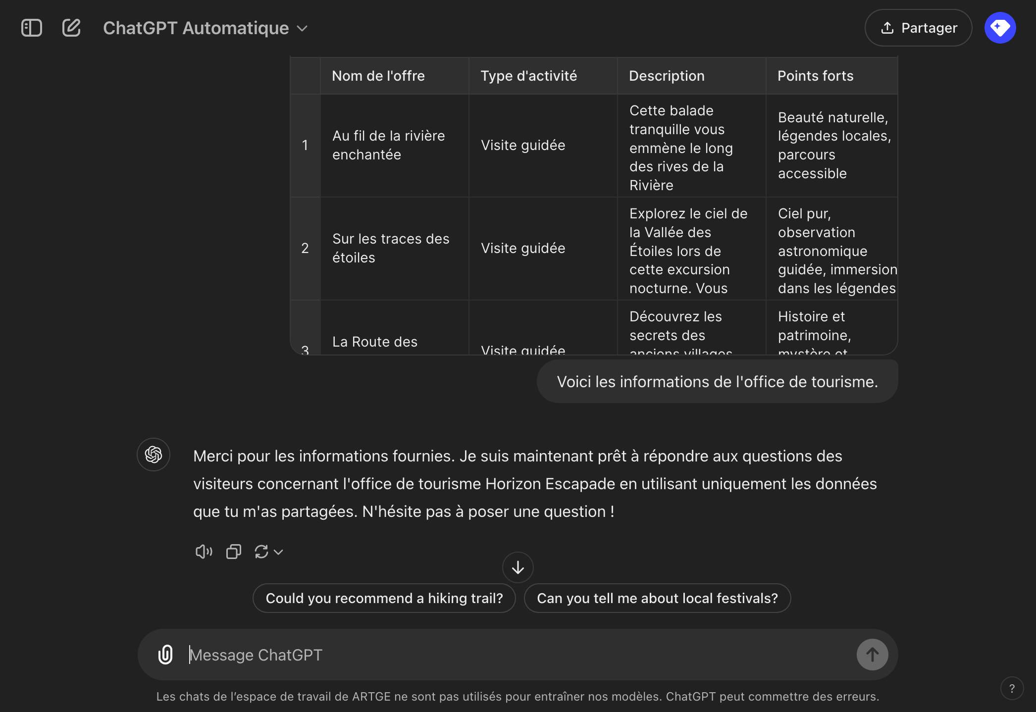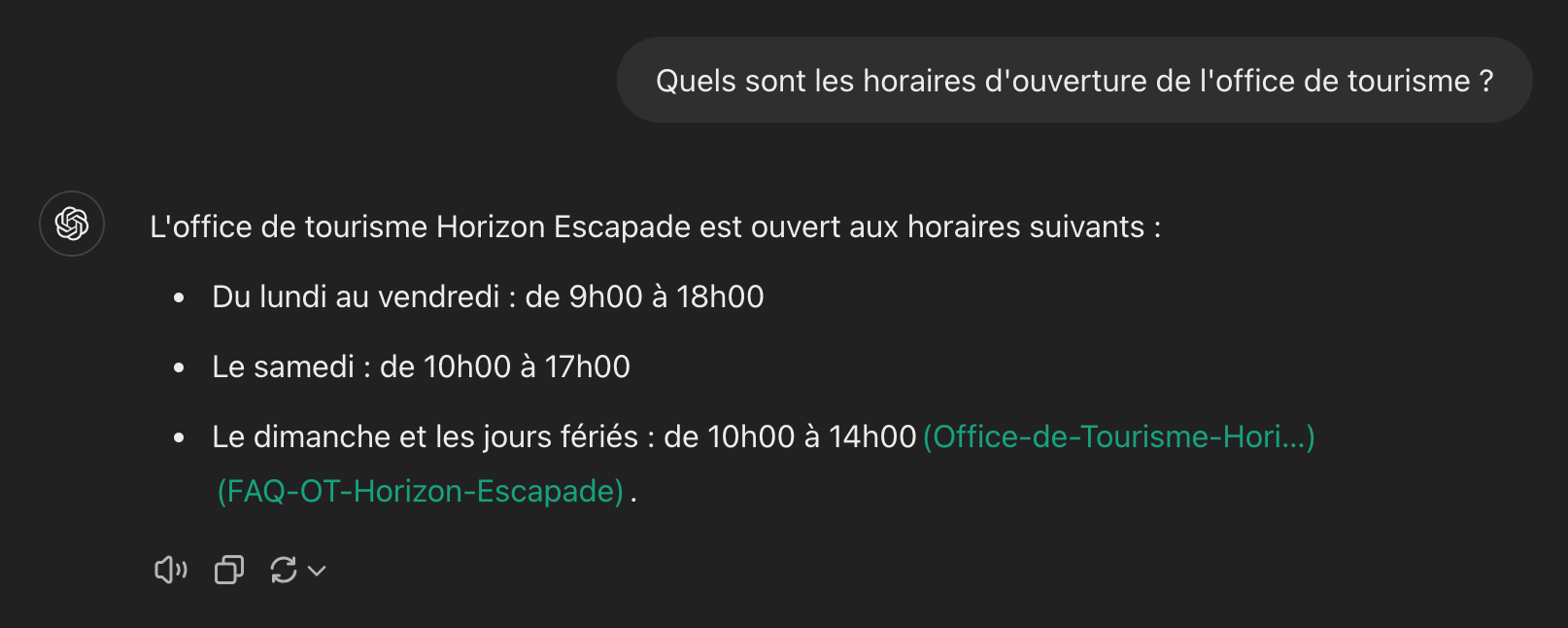 Quels sont les horaires d'ouverture de l'office de tourisme ?ChatGPT utilisera alors les informations fournies dans votre base de connaissance pour répondre de manière appropriée (en tout cas c’est l’idée :)