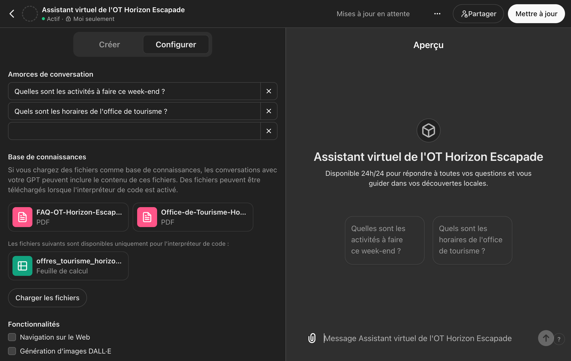 Ce sont des questions qui se présenteront sous forme de boutons à l’accueil de votre GPT. Dans notre exemple j’en ai créé 2 :”Quelles sont les activités à faire ce week-end ?”
