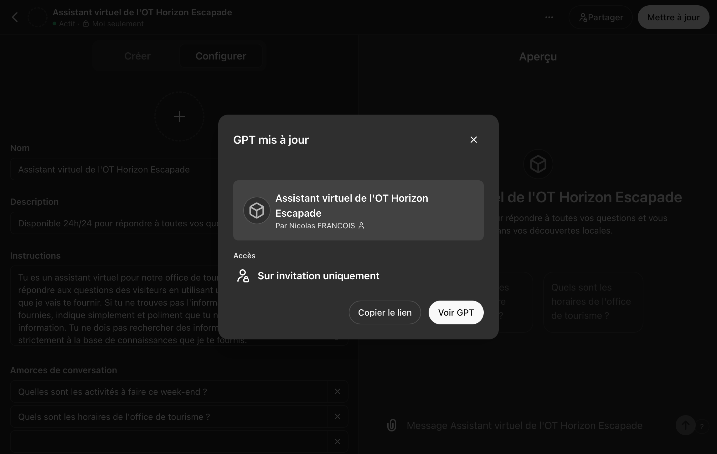 - Une fois le modèle testé et validé, vous pouvez cliquer sur le bouton “Créer” (en haut à droite) puis donner l'accès à vos équipes en copiant-collant le lien fourni (via le bouton en haut à droite). Elles pourront alors interroger ce Custom GPT via une interface de chat simplifiée.