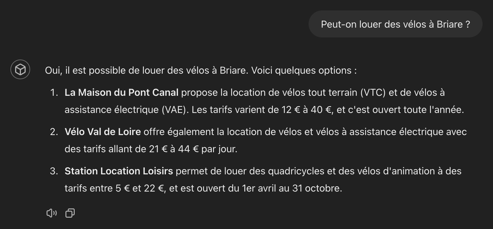 Peut-on louer des vélos ?Le Custom GPT fournira une réponse en fonction des données préchargées :