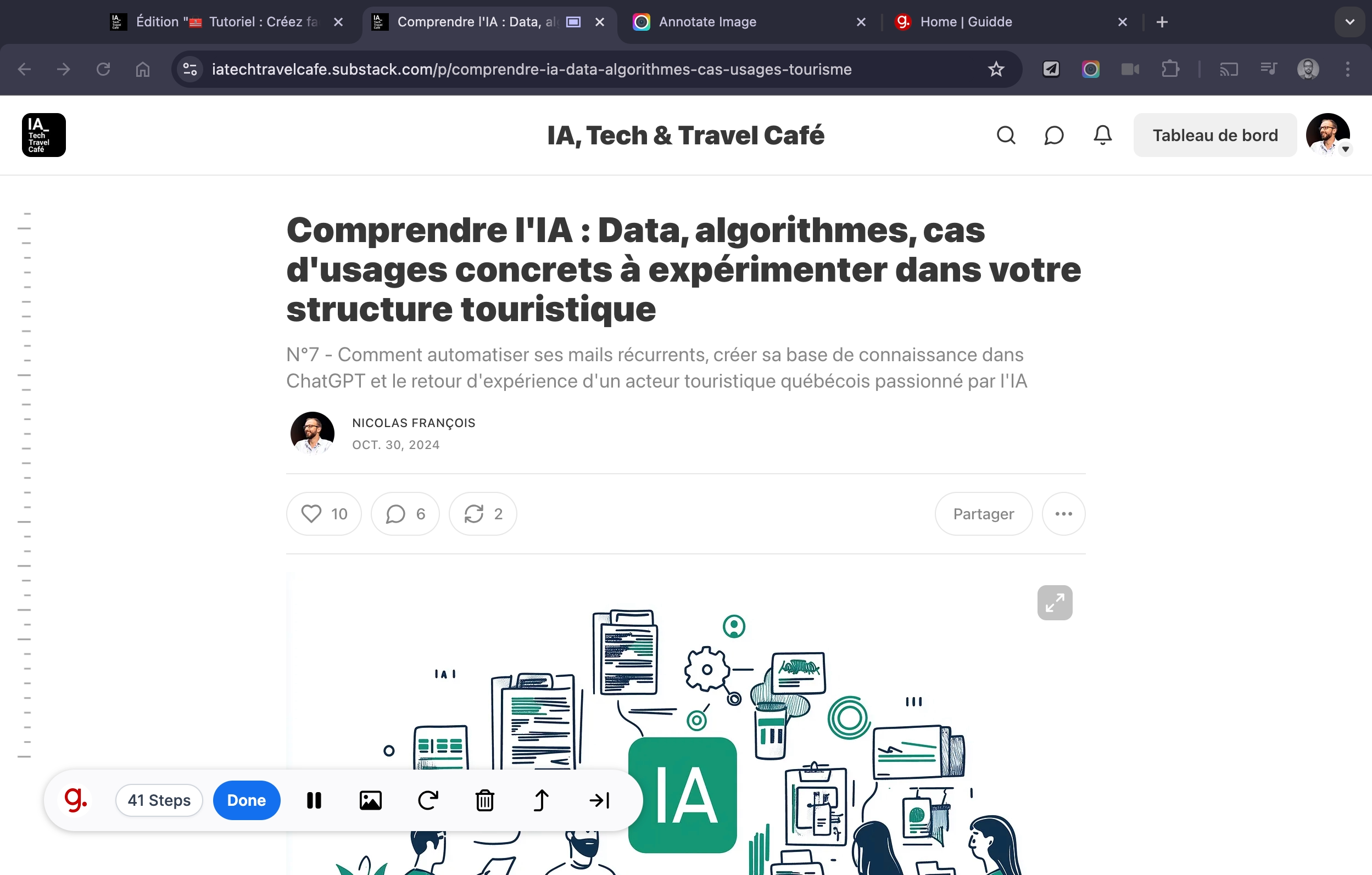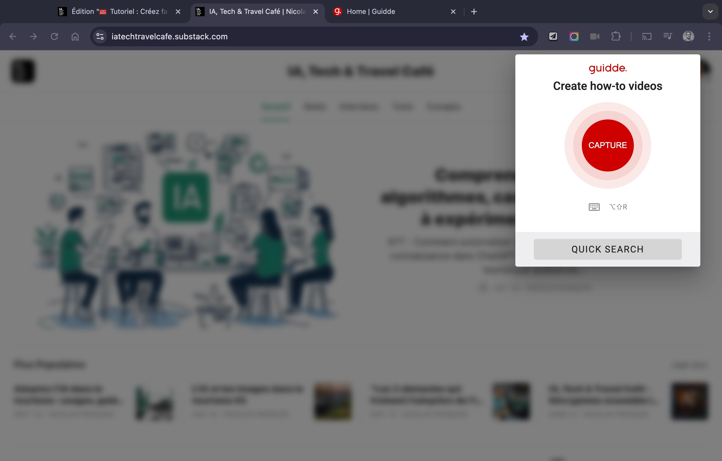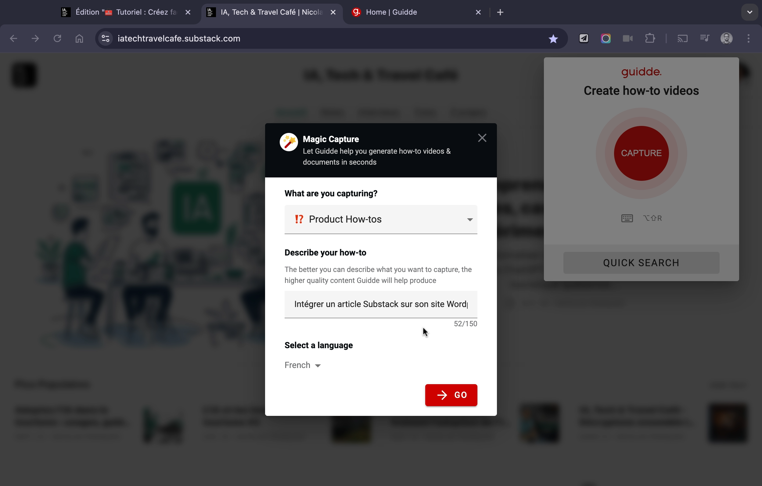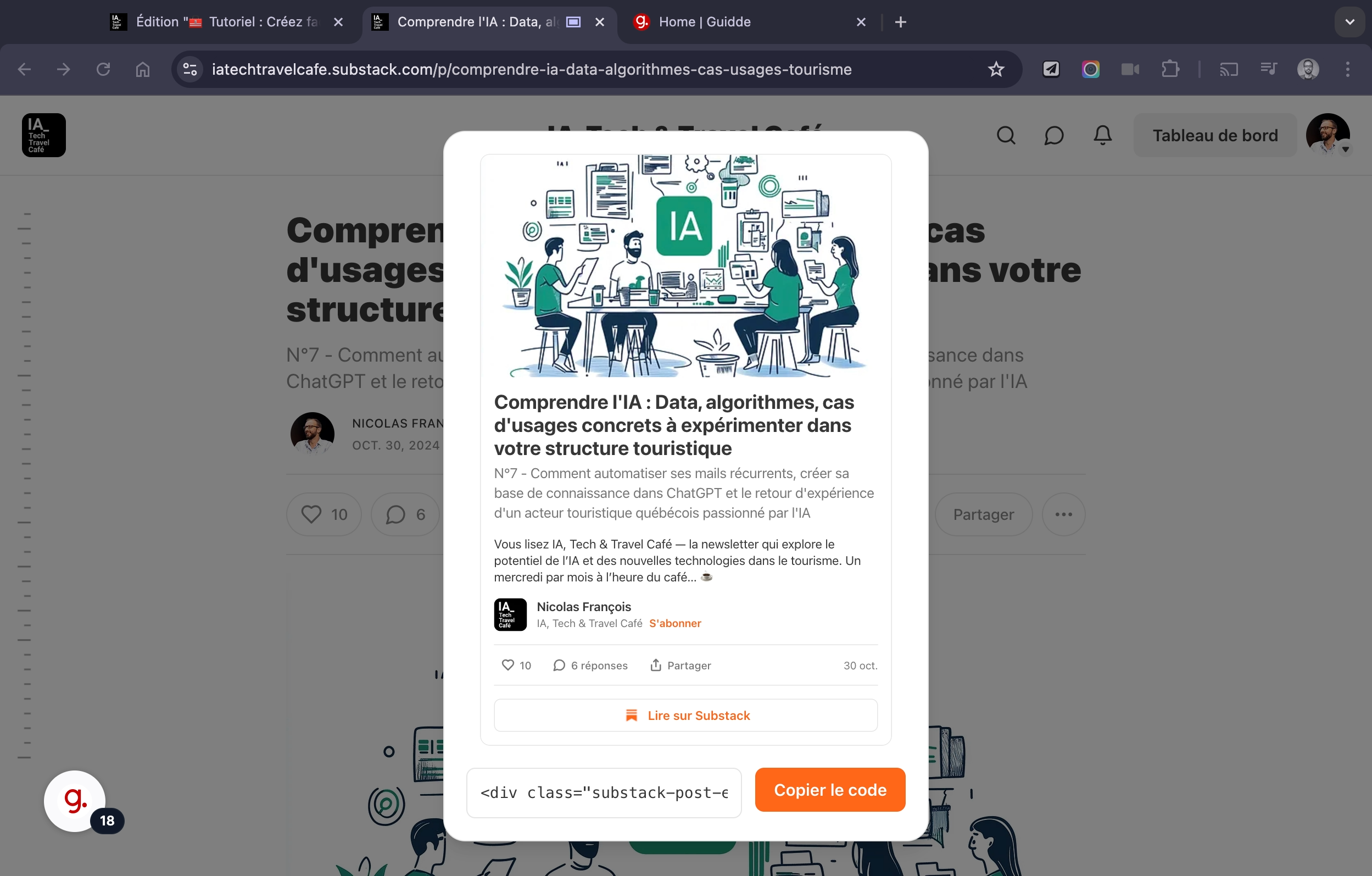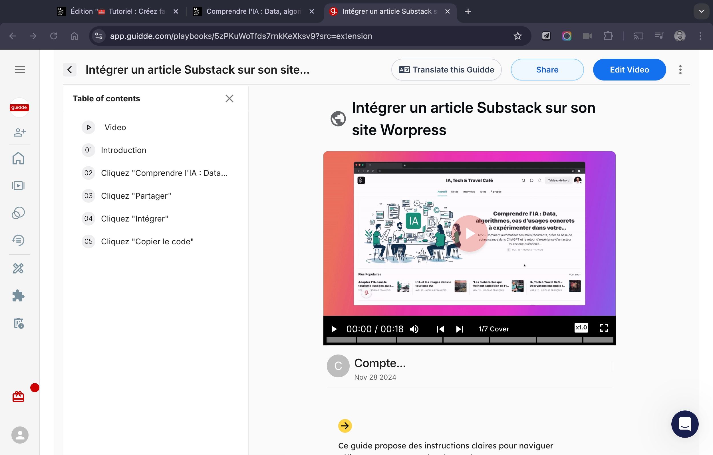 👉 Pour illustrer les possibilités de Guidde, j’ai réalisé un tutoriel rapide montrant comment intégrer un article Substack (IA, Tech & Travel Café) dans un site WordPress.